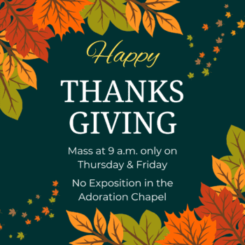 The parish office will be closed on Thur. Nov. 27 and Fri. Nov. 28 for Thanksgiving. There will only be one Mass at 9 a.m. on Thursday and Friday, and there will be no Eucharistic Adoration in the chapel.