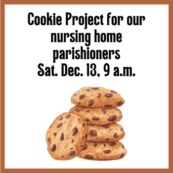 We need 100+ dozen cookies! We are packaging cookies for our 180 parishioners in our nursing homes and for our homebound. Please bring your homemade cookies to the Holy Family Hall (parish hall) before 9 a.m. Stay to help us package them up! Sponsored by the Women of Risen Christ.
