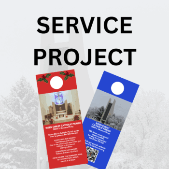 We are making door hangers to invite our neighbors living near Risen Christ to visit our recently renovated church and get to know us! We need many volunteers to place door hangers on the front doors of the houses on the streets closest to Risen Christ. This a great family project! Each packet has only 20 or less door hangers, and should take no more than a half hour to put on door knobs. We need 60 volunteers. Please come Saturday, December 6, at 9:00 a.m. to the Holy Family Hall (parish hall) to pick up your packets. Please place them on the front doors sometime during the week of December 6 – 13. This project just involves dropping off the hangers – no doorbell ringing!