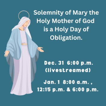 January 1 is the Solemnity of the Blessed Virgin Mary, the Holy Mother of God. It is a Holy Day of Obligation. Masses are on December 31 at 6 P.M. (anticipatory; livestreamed), and on January 1 at 8 a.m., 12:15 p.m. and 6 p.m. The parish office will be closed on Thursday, Jan. 1, in observance of the holy day of obligation.