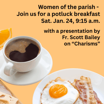 ALL women are invited to participate in a potluck breakfast, followed by a special presentation by Fr. Scott Bailey on Charisms. (And potluck means PotLUCK – bring a dish to share – no sign up necessary)