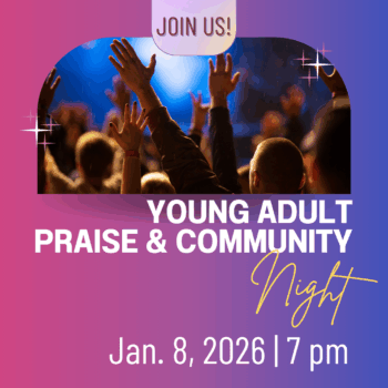 Young adults are invited to join us for our monthly Praise and Community evening. Start in the church for inspiring and uplifting music, and then join us in the upstairs lounge for fellowship (and food!) Join our announcement-only “GroupMe” to stay informed!