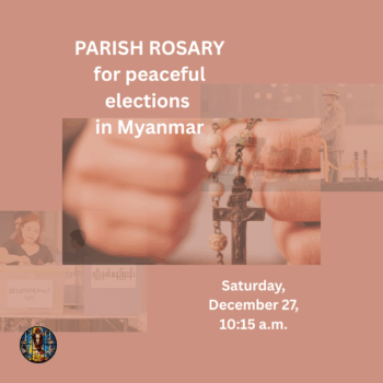 Myanmar’s first election in nearly five years is scheduled for December 2025 amidst ongoing violence and humanitarian distress. The people of Myanmar will vote in an election imposed by the junta. This military-controlled ballot will be conducted in an atmosphere rife with threats and violence putting the lives of civilians at risk. Join Risen Christ parishioners on Saturday, December 27, at 10:15 a.m. as we pray the Rosary for a peaceful election.