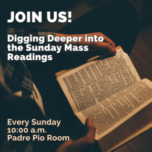 Join us for weekly Bible Study in the Padre Pio room.  Open to those in their 20’s and 30’s. No registration is necessary!