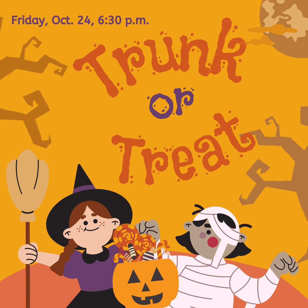 Then we’ll parade out to the parking lot for trunk or treating at 7:00 p.m. We are looking for 35 people to host trunks and hand out candy to approximately 100 people. We’ll award a $25 gift card for the best decorated trunk! Click here to host a trunk.